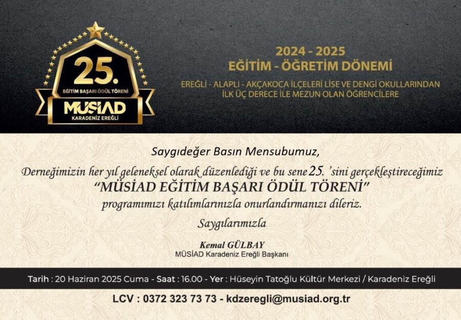 Müstakil Sanayici ve İş Adamları Derneği (MÜSİAD) Karadeniz Ereğli Şubemizin geleneksel hale getirmiş olduğu “MÜSİAD Eğitim Başarı Ödül Töreni” programının bu sene 25.’sini gerçekleştireceğiz.