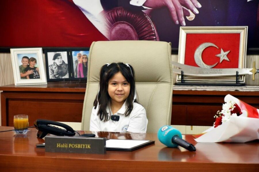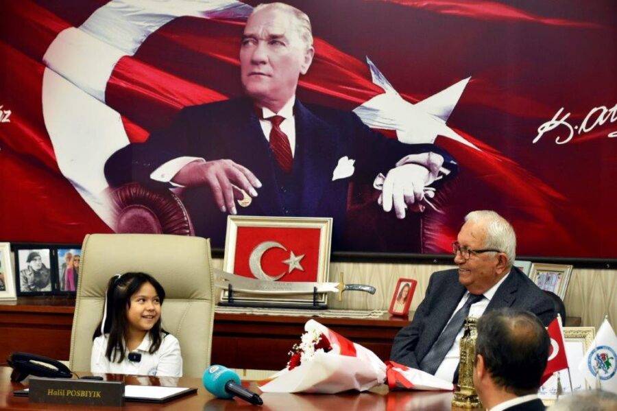 Okul Müdürü Cem Akbaş ve sınıf öğretmeni Figen Özcan ile birlikte başkan yardımcıları tarafından makamda karşılanan Aden Su Cebir, Başkan Posbıyık’a çiçek takdiminde bulundu. Koltuğa oturan Cebir, tüm çocukların Ulusal Egemenlik ve Çocuk Bayramı’nı kutladı.