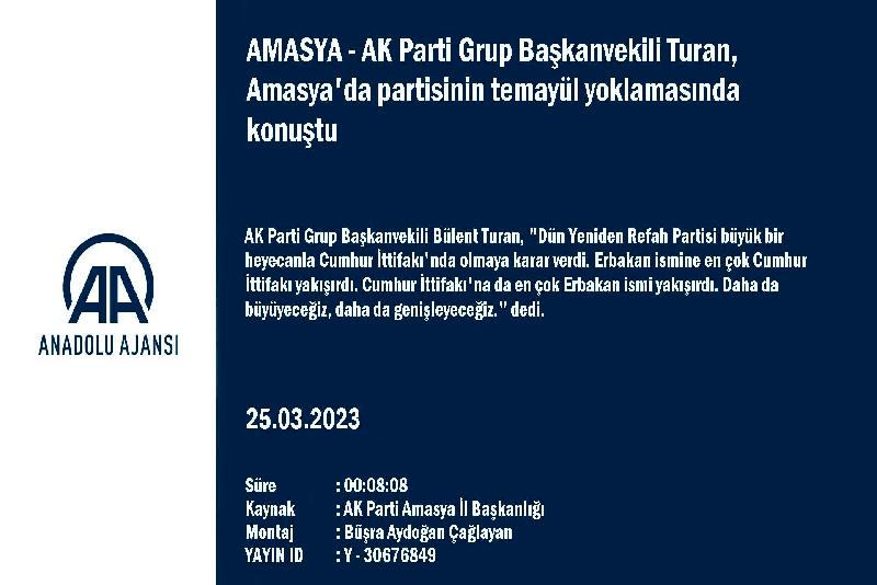 AMASYA – 67aydinhaber – AK Parti Küme Başkanvekili Bülent Turan, “Dün Tekrar Refah Partisi büyük bir heyecanla Cumhur İttifakı'nda olmaya karar verdi. Erbakan ismine en çok Cumhur İttifakı yakışırdı. Cumhur İttifakı'na da en çok Erbakan ismi yakışırdı. Daha da büyüyeceğiz, daha da genişleyeceğiz.” dedi.