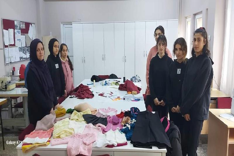 Bu kapsamda Alaçam Mesleksel ve Teknik Anadolu Lisesi Moda Tasarım Teknolojileri alanı öğretmen ve öğrencilerinin hazırladığı çoğunluğu bebek ve çocuk kıyafeti olan giysiler, sarsıntı bölgesine ulaştırıldı.