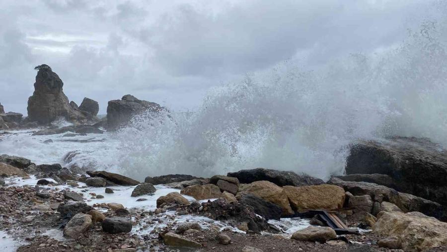 Saatteki hızı 45 kilometreyi bulan fırtınayla birlikte Küçük Liman mevkiinde kayalıklara vurup kırılan dalgalarla beraber sular metrelerce yüksekliğe çıktı.