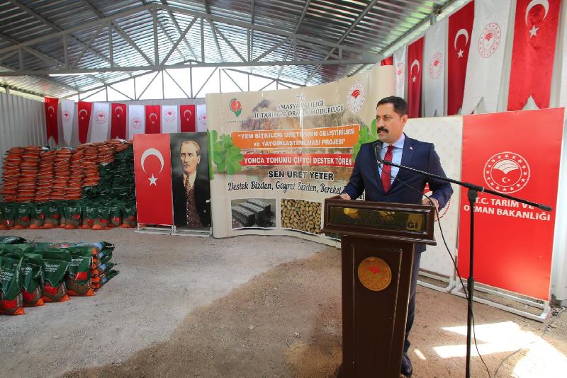 “Amasya'mızı bölgemizin kırımızı et üretim merkezi yapma maksadı doğrultusunda, yem bitkileri üretimini desteklemeye devam edeceğiz. Bu kapsamda bugün, hayvancılık için değerli bir kaba yem kaynağı olan yonca tohumlarını üreticilerimize teslim ediyoruz. 11 bin dekarlık bir alanda ekilmek üzere, toplam bedeli 2 milyon 750 bin lira olan, 55 ton yonca tohumunu Vilayet Özel Yönetimimizin yüzde 50 hibe dayanağı ile üreticilerimize sunuyoruz. Dağıtımını yapacağımız bu tohumların Amasya tarım ve hayvancılığı ile üreticilerimize güzel olmasını diliyor, Amasya'mıza her alanda büyük yatırımlar yaparak, insanımızın hayat standartlarını yükselten başta Sayın Cumhurbaşkanımız olmak üzere, hükümetimize ve bu projeleri hayata geçirmemiz için bizleri destekleyen Tarım ve Orman Bakanlığımıza ve ayrıyeten Vilayet Genel Meclisimiz ile Özel Yönetimimize teşekkür ediyorum.”
