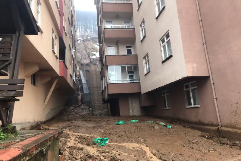 İlçenin Gündoğdu Mahallesi'nde, 34 hanenin bulunduğu 2 binanın art kısmındaki yamaçta yağışlar sonucu heyelan meydana geldi.