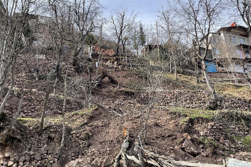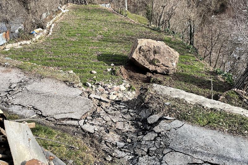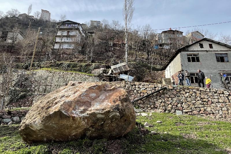 Merkeze bağlı Dere Mahallesi'nde kar sularının erimesi ve yağmur nedeniyle yamaçtan kopan kaya kütlesi, bölgedeki 4 meskenin ortasından yuvarlanarak tarım yerine düştü.