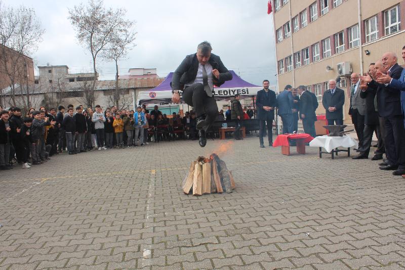 İlçe Ulusal Eğitim Müdürü Mehmet Ali Katipoğlu ve davetliler, okul bahçesinde yakılan nevruz ateşinin üzerinden atladı.