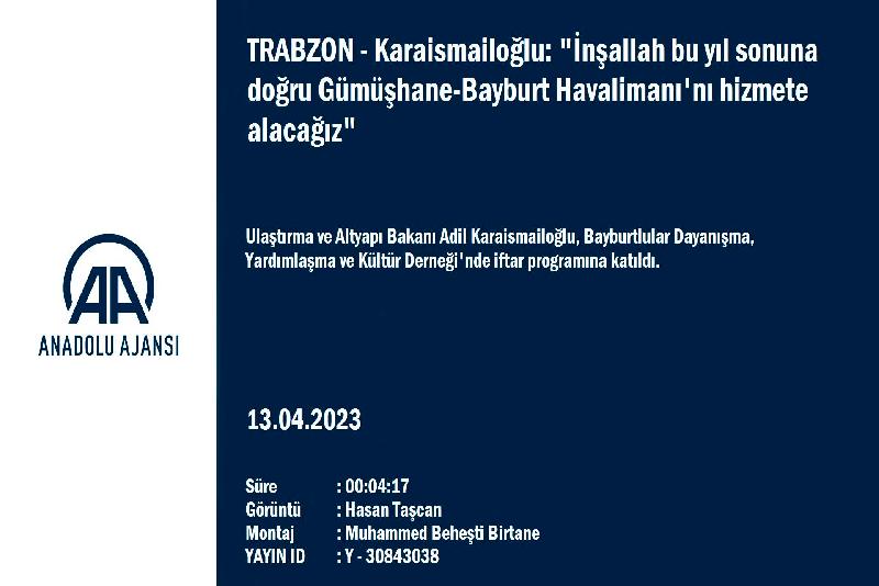 TRABZON – 67aydinhaber – Ulaştırma ve Altyapı Bakanı Adil Karaismailoğlu, “İnşallah bu yıl sonuna gerçek Gümüşhane-Bayburt Havalimanı'nı hizmete alacağız.” dedi.