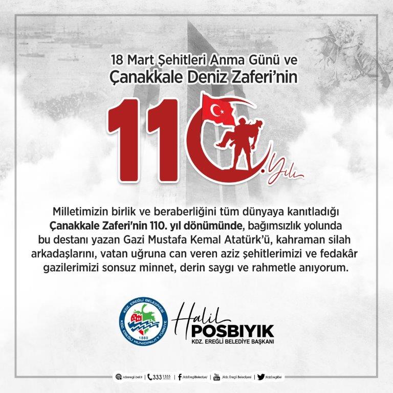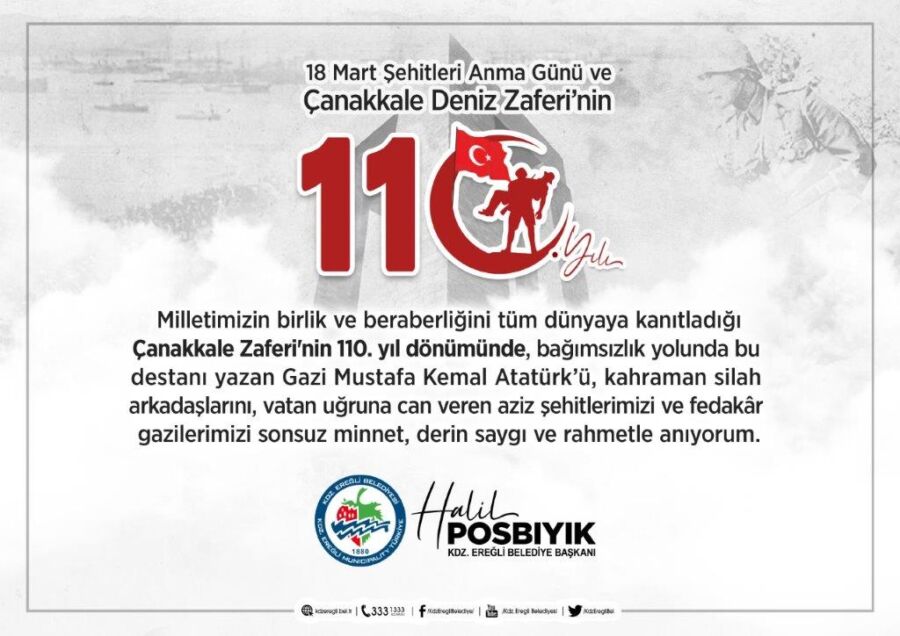 Kdz. Ereğli Belediye Başkanı Halil Posbıyık, 18 Mart Şehitleri Anma Günü ve Çanakkale Deniz Zaferi’nin 110. Yıldönümünde anma mesajı yayımladı