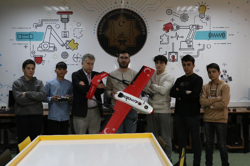 Yaklaşık 7 ay önce “Robohatip” takımı adı altında okulun atölyesinde çalışmalara başlayan ekip, dikey iniş kalkış yapabilen İHA tasarladı.