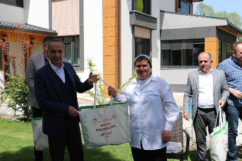 Okçular köyünde gerçekleşen dağıtım töreninde tüm katılımcılara, içinde propolis tuzağı, körük, eldiven, maske, pense ve çerçeve askısı bulunan arıcılık başlangıç paketi hediye edildi.