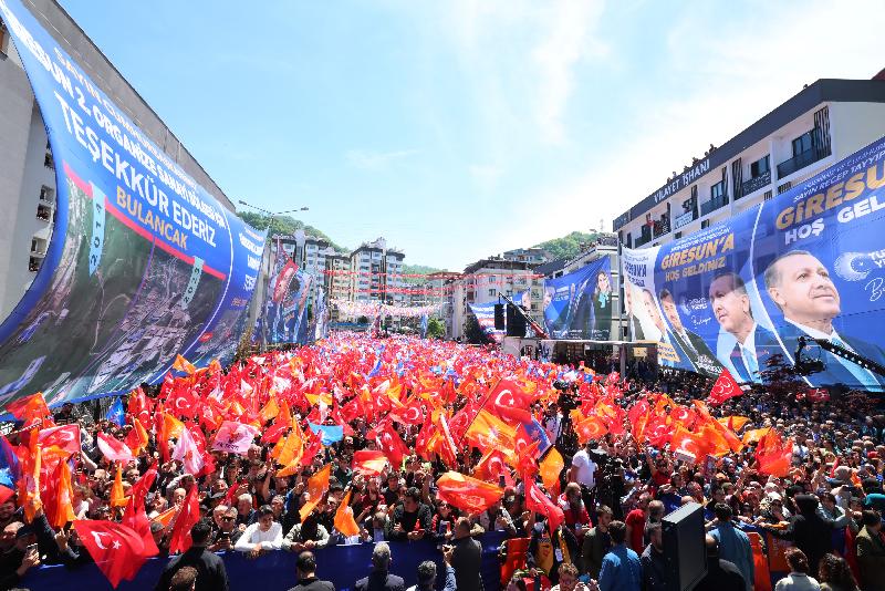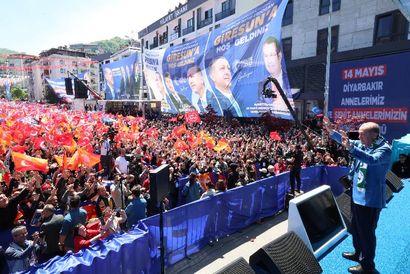 Erdoğan, partisinin Giresun Valiliği yanındaki İnönü Caddesi'nde düzenlediği mitingde yaptığı konuşmada, alandaki coşkuya dikkati çekerek, 14 Mayıs’ta Giresun'un sandıkları “gümbür gümbür patlatacağına” inandığını söyledi.