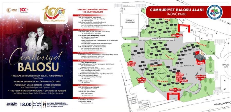 Akşam ise Atatürk Anıtının arkasında bulunan İnönü Parkında, Cumhuriyetin 100.Yılına özel olarak Ereğli’de ilk kez, vatandaşlarımızla hep beraber olacağımız ücretsiz bir Cumhuriyet Balosu düzenleyeceğiz.
