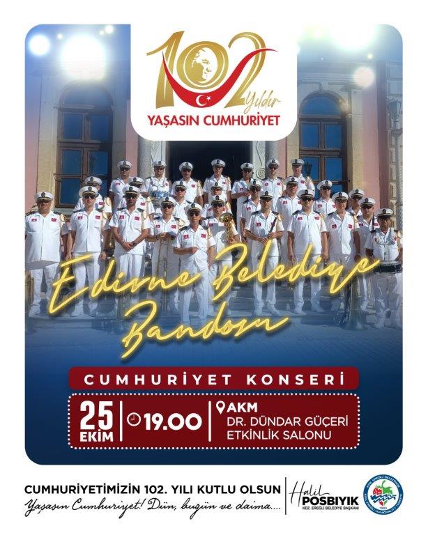 Cumhuriyet kutlamaları, 25 Ekim Cumartesi akşamı Atatürk Kültür Merkezi Dr. Dündar Güçeri Etkinlik Salonu’nda, Edirne Belediye Bandosu tarafından marş ve seçkin eserlerin seslendirileceği Cumhuriyet Konseri ile başlayacak.