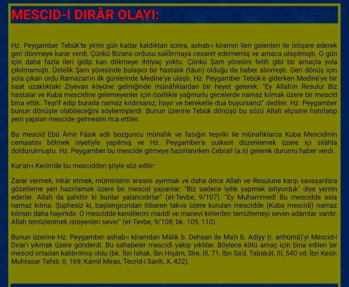 Ebû Âmir mektubunda Bizans valisiyle görüştüğünü, kendileri destek olurlarsa Bizanslılar’ı Medine’yi kuşatmaya ikna edebileceğini söylüyordu. Münafıkların bu konuyu görüşebilmeleri için dikkat çekmeyecek bir mekâna ihtiyaçları vardı.