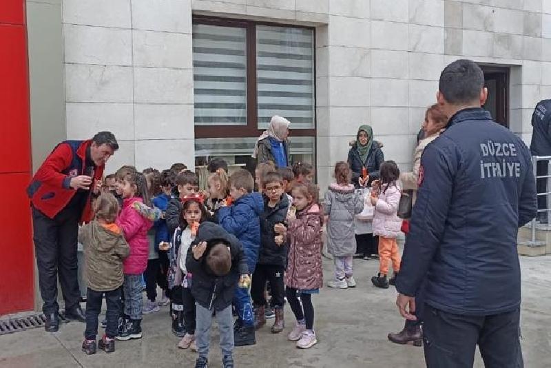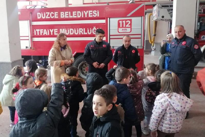 Öğretmenleriyle Düzce Belediyesi İtfaiye Müdürlüğünü gezen öğrenciler, vazifelilerden meslek hakkında bilgi aldı.