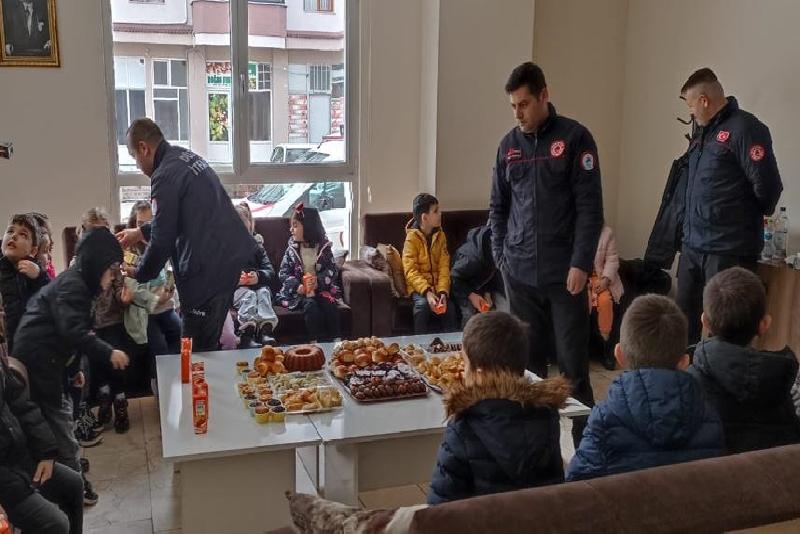 Öğrenciler, daha sonra meskende annelerinin hazırladığı kek, kurabiye ve börekleri itfaiyecilere ikram etti.