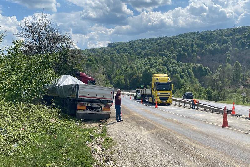 Ö.Ş. idaresindeki 18 BA 310 idaresindeki tır, D-655 Düzce-Zonguldak Batı Karadeniz bağlantı yolu Hiciz rampaları mevkisinde virajı alamayarak karşı yöne geçti. Yol kenarındaki tarlaya giren tır, ağaca çarptı.