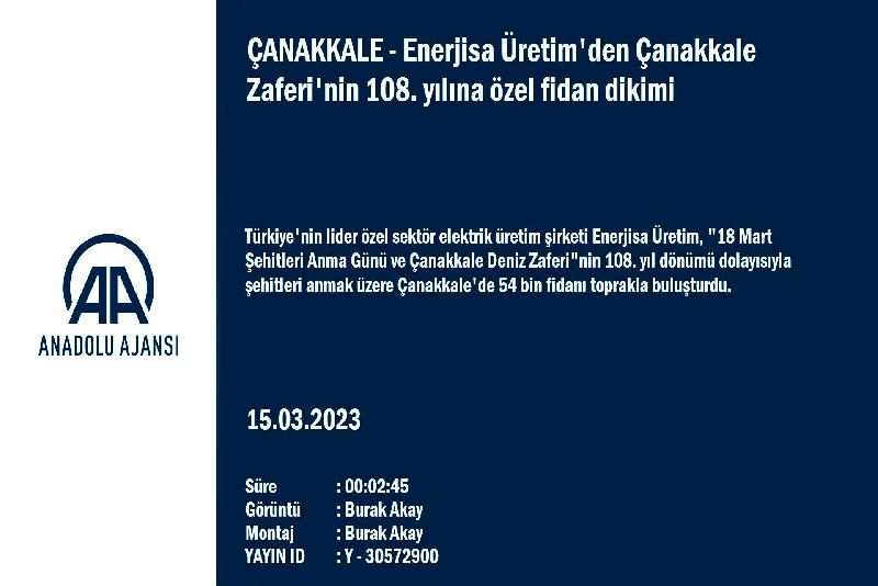 ÇANAKKALE – 67aydinhaber – Türkiye'nin önder özel kesim elektrik üretim şirketi Enerjisa Üretim, “18 Mart Şehitleri Anma Günü ve Çanakkale Deniz Zaferi”nin 108. yıl dönümü hasebiyle şehitleri anmak üzere Çanakkale'de 54 bin fidanı toprakla buluşturdu.