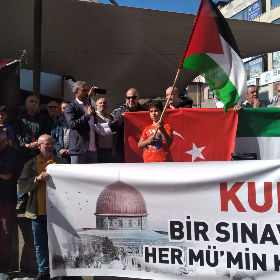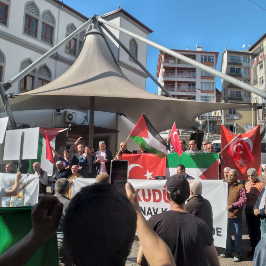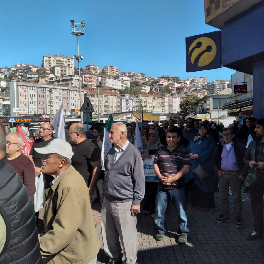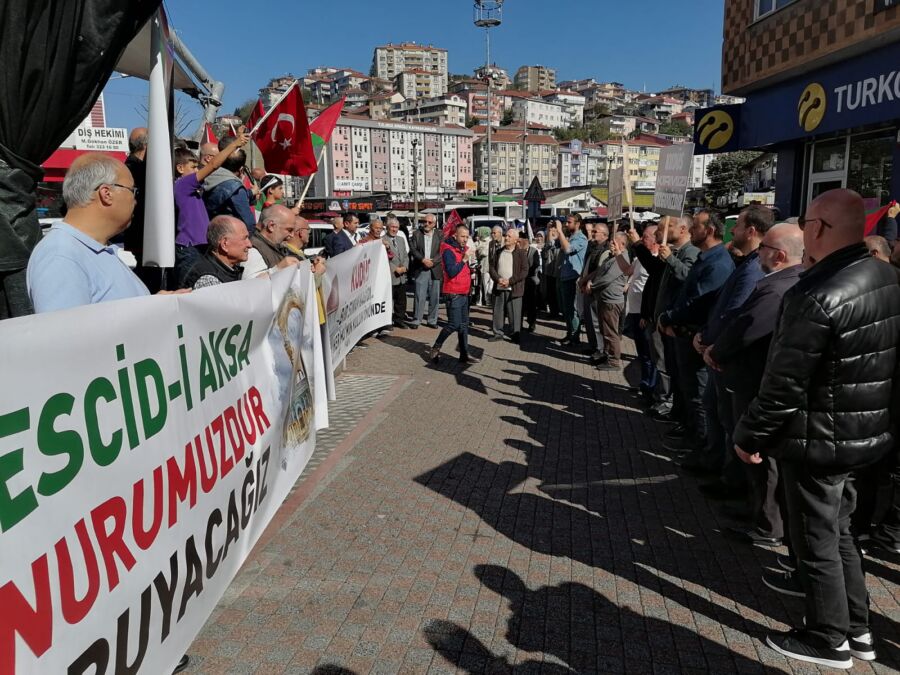 Dünyanın birçok yerinde çeşitli protestolar gerçekleşirken Türkiye’nin birçok ilinde eşzamanlı olarak Cuma namazı sonrasında gerçekleştirilen gıyabi cenaze namazı, dua ve basın açıklamasına Kdz. Ereğli’den de destek geldi. Kdz. Ereğli Ümmet platformu çağrısı ile birçok sivil toplum kuruluşu ve vatandaşların katılımı ile yoğun bir katılımla gerçekleşen programda İsrail’in insanlık dışı saldırılarında hayatlarını kaybederek şehit olan bebekler, çocuklar, gençler, yaşlılar, kadın ve erkekler için gıyabi cenaze namazını kılındı, dualar edildi. Yapılan basın açıklamasıyla Siyonist İsrail rejiminin yıllardır yaptığı sistemli işgal, sindirme, soykırım ve zulüm politikalarına karşı Hamas öncülüğünde gerçekleştirilen Aksa Tufanı operasyonunun bir meşru müdafa olduğu belirtilerek Filistin kıyamına destek verilmiştir. Yıllardır bombalanan her gün birer ikişer katledilerek, bombalanarak, evlerine ve işyerlerine el konulan, küçük yaştaki erkek çocuklara varıncaya kadar hukuksuz tutuklamalar yapılarak ailelerinden yıllarca ayrı hapishanelerde yatırılan bir halkın kendi imkanları çerçevesinde işgale ve zulme başkaldırmasından, dur demesinden ve kendi topraklarına sahip çıkmak istemesinden ve bir var olma savaşı vermesinden daha doğal ne olabilir denen açıklamada basın ve sosyal medya üzerinden gerçekleştirilen bilgi kirliliği ve algı yönetimi operasyonlarına dikkat edilmesi gerektiği vurgulandı.