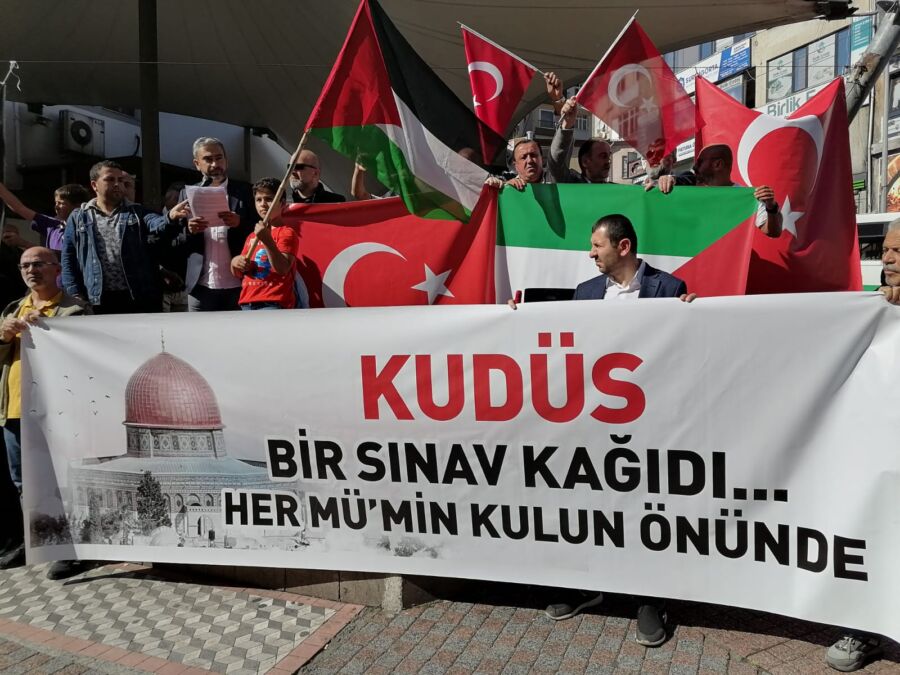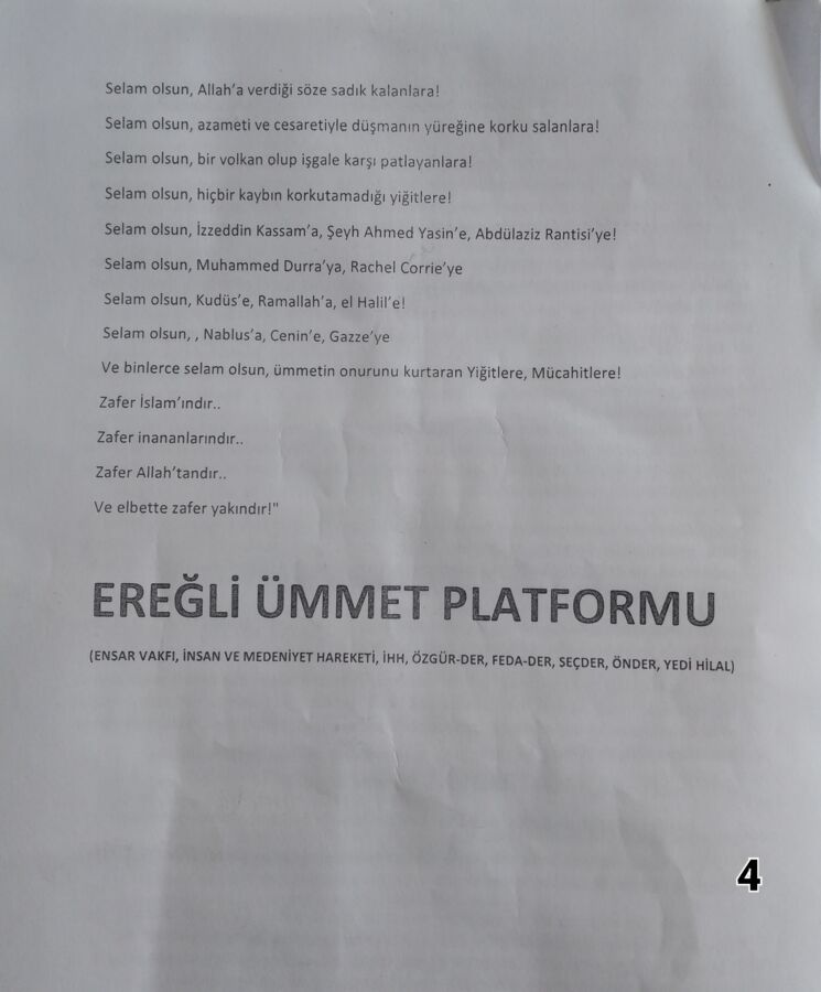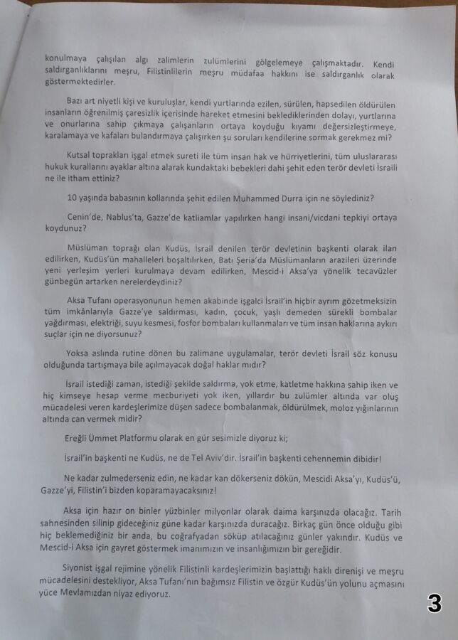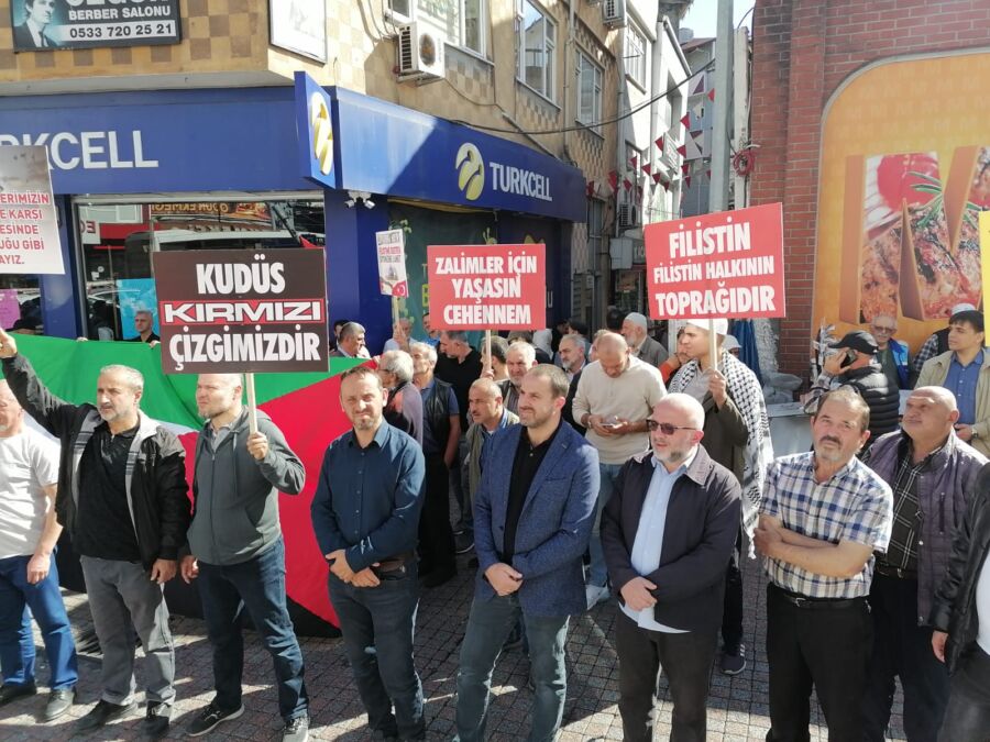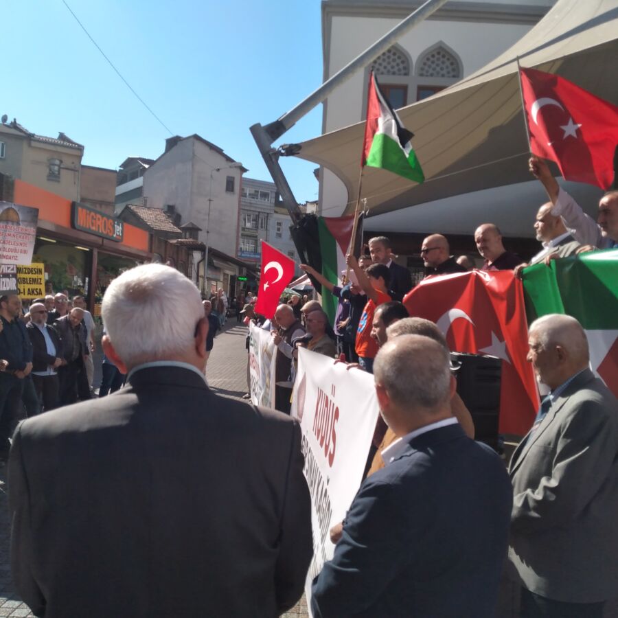 Dünyanın birçok yerinde çeşitli protestolar gerçekleşirken Türkiye’nin birçok ilinde eşzamanlı olarak Cuma namazı sonrasında gerçekleştirilen gıyabi cenaze namazı, dua ve basın açıklamasına Kdz. Ereğli’den de destek geldi. Kdz. Ereğli Ümmet platformu çağrısı ile birçok sivil toplum kuruluşu ve vatandaşların katılımı ile yoğun bir katılımla gerçekleşen programda İsrail’in insanlık dışı saldırılarında hayatlarını kaybederek şehit olan bebekler, çocuklar, gençler, yaşlılar, kadın ve erkekler için gıyabi cenaze namazını kılındı, dualar edildi. Yapılan basın açıklamasıyla Siyonist İsrail rejiminin yıllardır yaptığı sistemli işgal, sindirme, soykırım ve zulüm politikalarına karşı Hamas öncülüğünde gerçekleştirilen Aksa Tufanı operasyonunun bir meşru müdafa olduğu belirtilerek Filistin kıyamına destek verilmiştir. Yıllardır bombalanan her gün birer ikişer katledilerek, bombalanarak, evlerine ve işyerlerine el konulan, küçük yaştaki erkek çocuklara varıncaya kadar hukuksuz tutuklamalar yapılarak ailelerinden yıllarca ayrı hapishanelerde yatırılan bir halkın kendi imkanları çerçevesinde işgale ve zulme başkaldırmasından, dur demesinden ve kendi topraklarına sahip çıkmak istemesinden ve bir var olma savaşı vermesinden daha doğal ne olabilir denen açıklamada basın ve sosyal medya üzerinden gerçekleştirilen bilgi kirliliği ve algı yönetimi operasyonlarına dikkat edilmesi gerektiği vurgulandı.