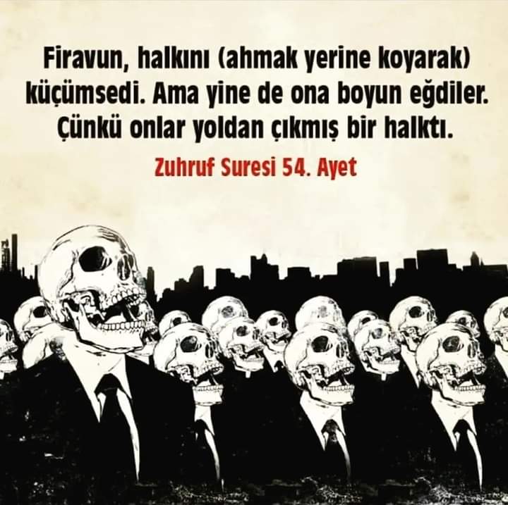 “Firavun kavmini küçük düşürdü, APTALLAȘTIRDI, onlar da kendisine boyun eğdiler. Zira yoldan çıkmış bir toplum idiler.” (Zuhruf, 54)