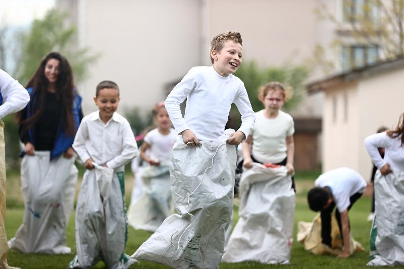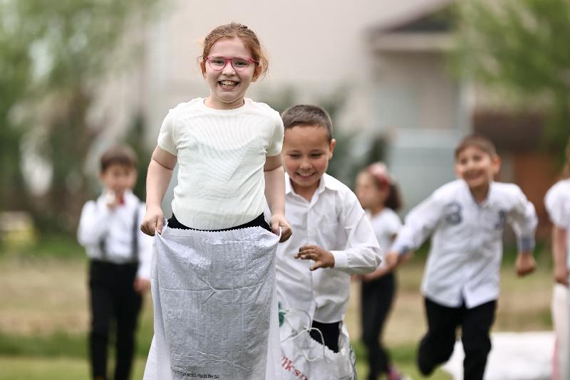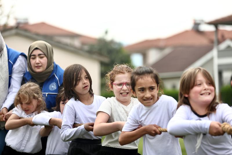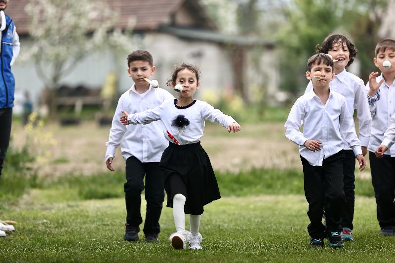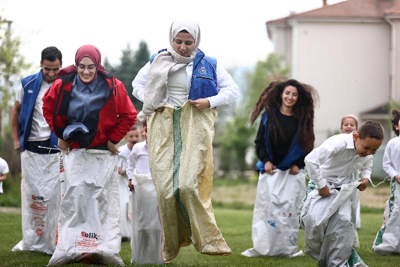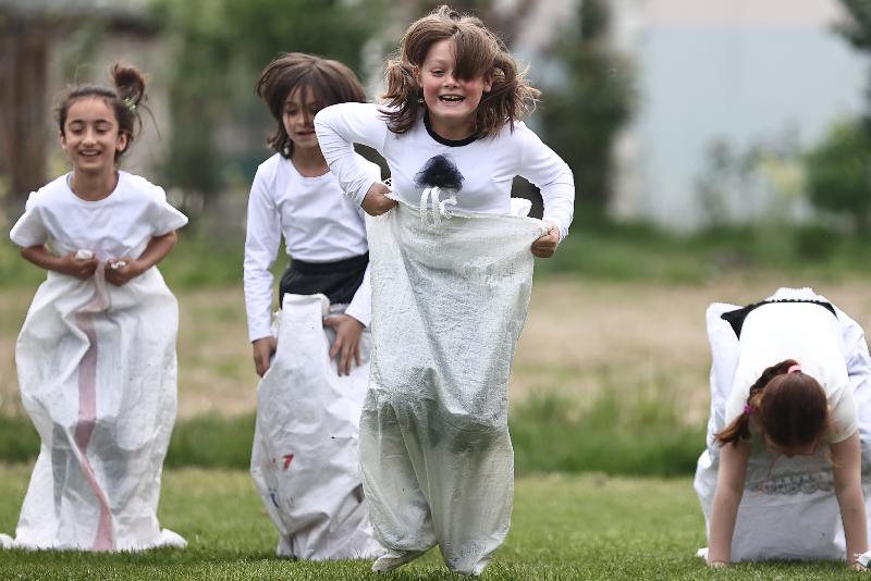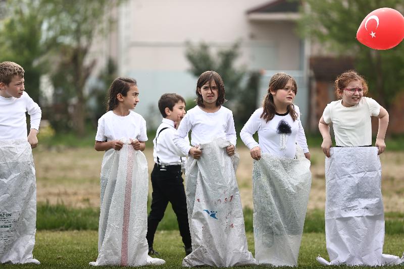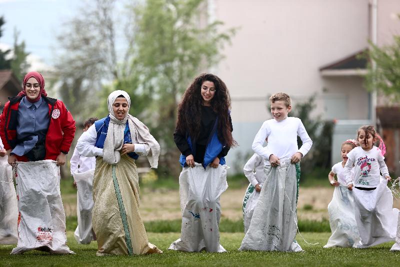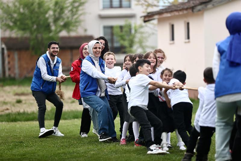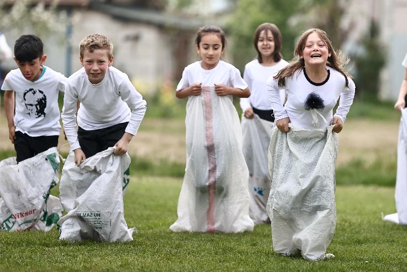 Okulları süsleyen gençler, çocuklarla çuval, halat çekme, yumurta taşıma oyunları oynayarak keyifli vakit geçirmesini sağlıyor.