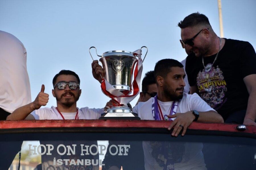 Kdz. Ereğli Belediyespor ve Belediye Başkanı Halil Posbıyık’ın kente getirttiği üstü açık otobüse aileleriyle birlikte binen futbolcular, teknik heyet ve Belediyespor yönetim kurulu üyeleri, şampiyonluk kupasını şehir turu atarak sporseverlerle paylaştı. Kentte her yer eflatun beyaz renklere büründü.