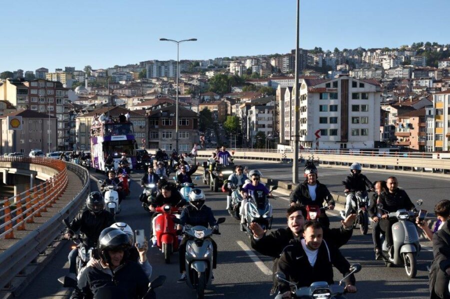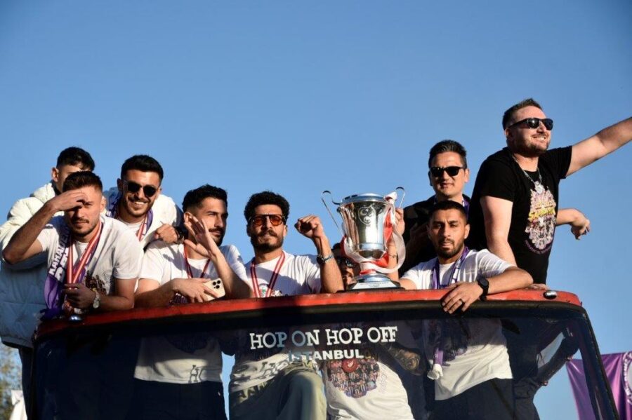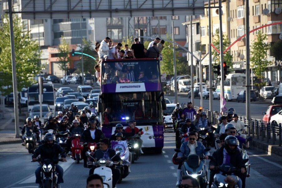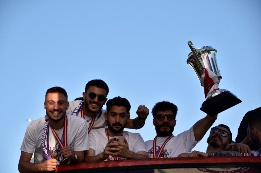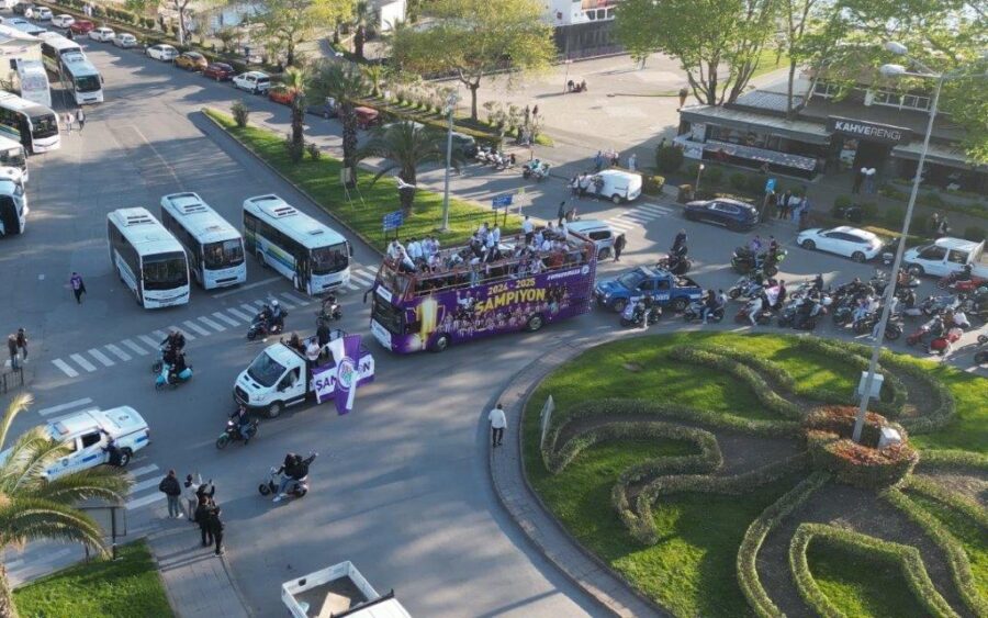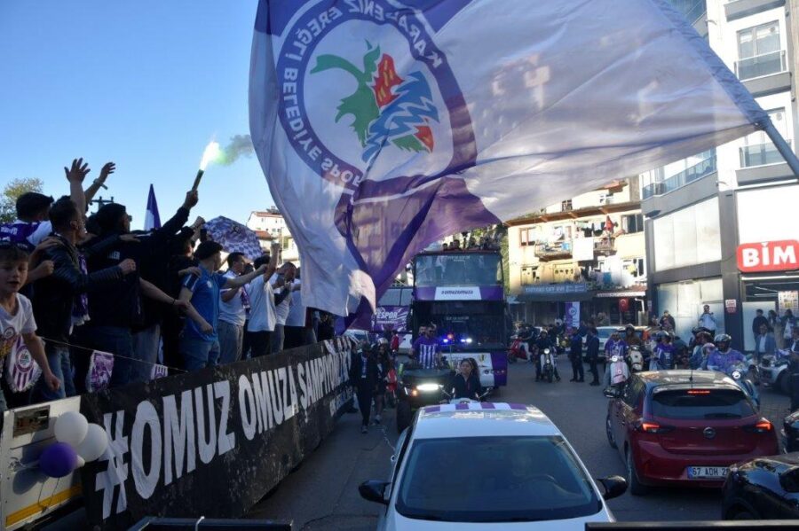 Kdz. Ereğli Belediyespor ve Belediye Başkanı Halil Posbıyık’ın kente getirttiği üstü açık otobüse aileleriyle birlikte binen futbolcular, teknik heyet ve Belediyespor yönetim kurulu üyeleri, şampiyonluk kupasını şehir turu atarak sporseverlerle paylaştı. Kentte her yer eflatun beyaz renklere büründü.