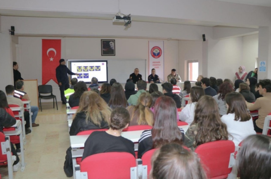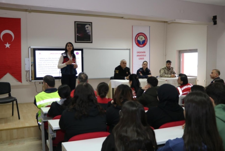 28 Mart 2023 günü Zonguldak Erdemir Anadolu Lisesi son sınıf öğrencilerine “Meslek Tanıtım” faaliyetleri kapsamında; Jandarmanın emniyet ve asayiş görevleri, faaliyet alanları, vizyon ve misyonu hakkında, Zonguldak İl Jandarma Komutanlığının farklı birimlerinde görev icra eden farklı rütbedeki personel tarafından Jandarma mesleği tanıtılarak, Jandarma ve Sahil Güvenlik Akademisine öğrenci alım şartlarının neler olduğu, Jandarmanın ihtiyaç duyduğu üstün nitelikli Subay, Astsubay ve diğer personellerin nasıl yetiştirildiği konusunda öğrencilere soru-cevap eşliğinde bilgilendirme yapılmıştır.