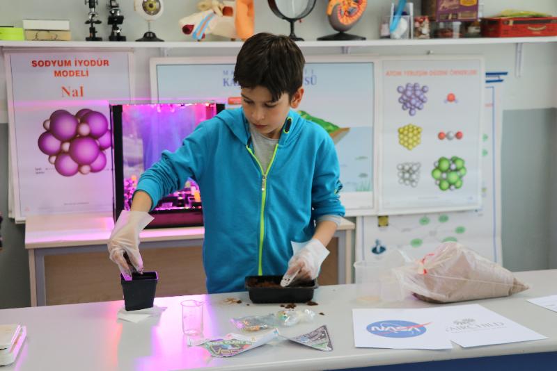 Proje kapsamında NASA'nın kendi bünyesinde yaptığı uzay araştırmalarına bilgilerle dayanak sağladıklarını aktaran Kılıç, öğrencilerin NASA'nın kendilerine gönderdiği büyüme odası, 3 çeşit bitki tohumu, özel toprak karışımı ve gübreyle ekim yaptıklarını söz etti.