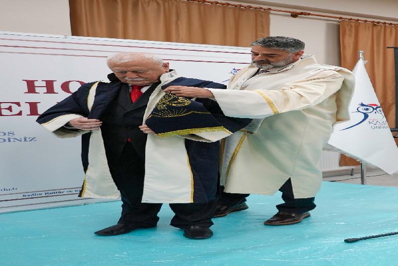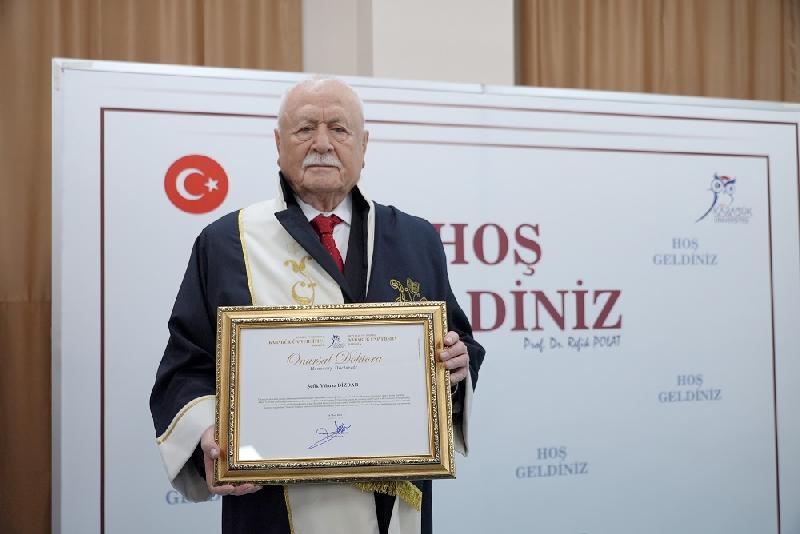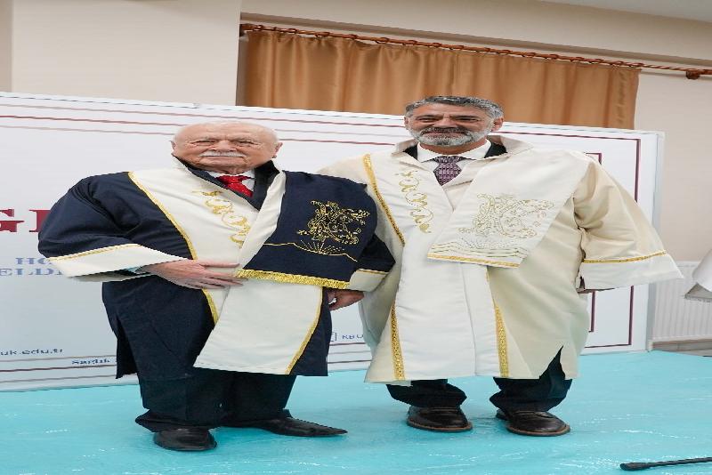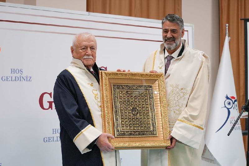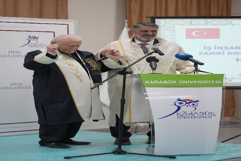 Karabük Üniversitesi Rektörü Prof. Dr. Refik Polat, Karabüklü hayırsever iş insanı Şefik Yılmaz Dizdar'a “fahri doktora” diplomasını takdim etti.