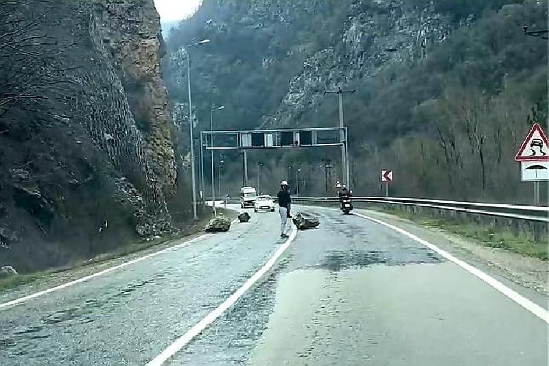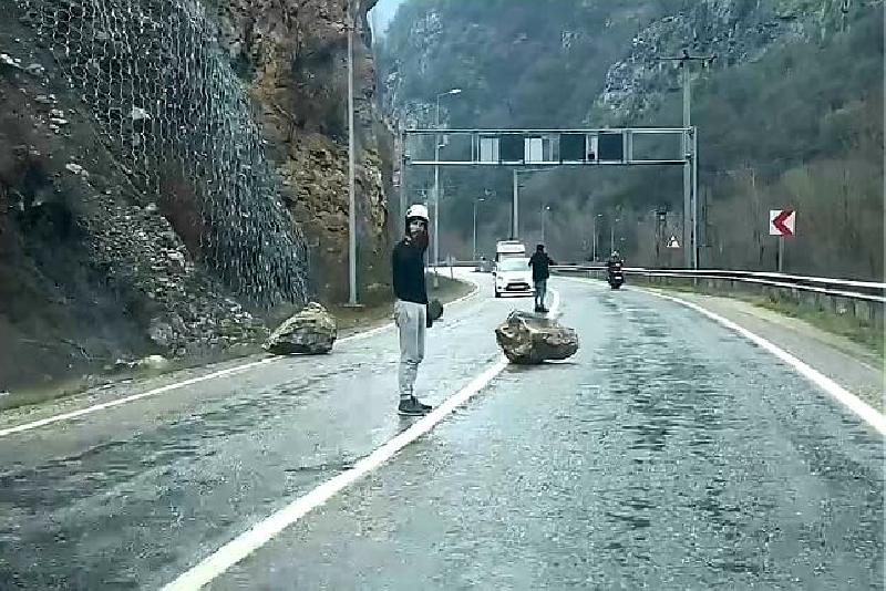 Kaya modüllerinin düşmesi üzerine yolda güvenlik tedbiri alan jandarma takımları, trafiği tek şeritten sağlıyor.