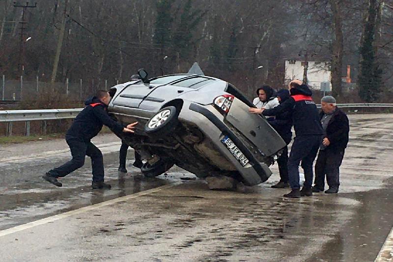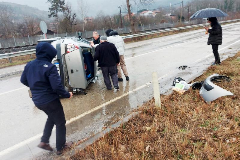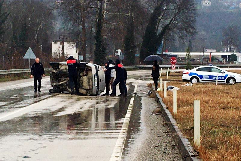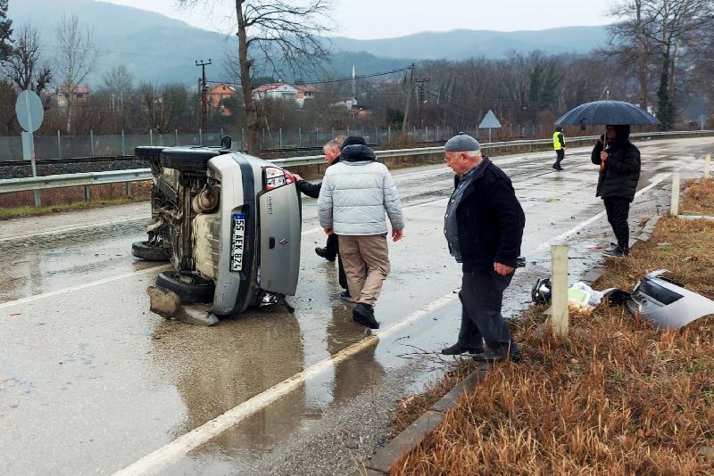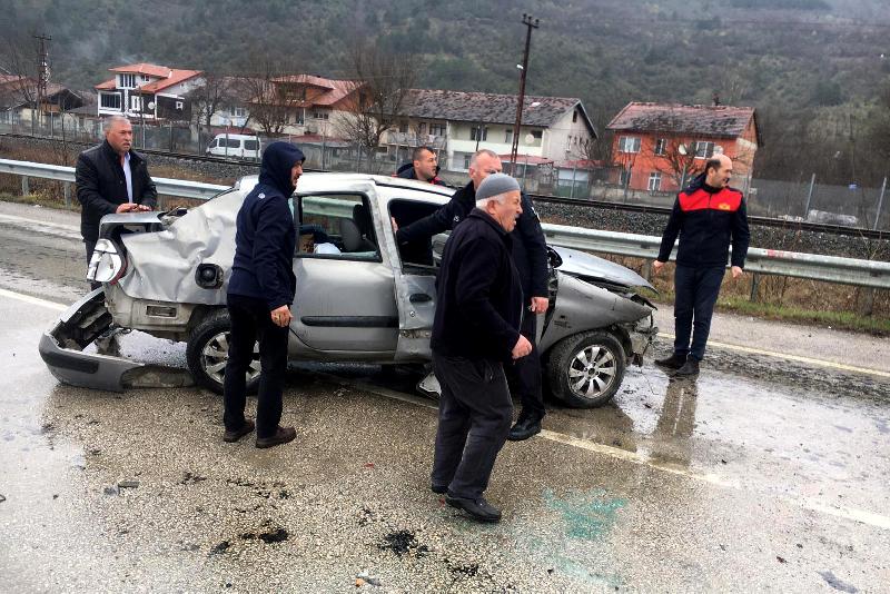 H.N. (53) yönetimindeki 55 AEK 824 plakalı araba, Yenice-Zonguldak kara yolu Sanayi Kavşağı'nda refüje çarparak devrildi.
