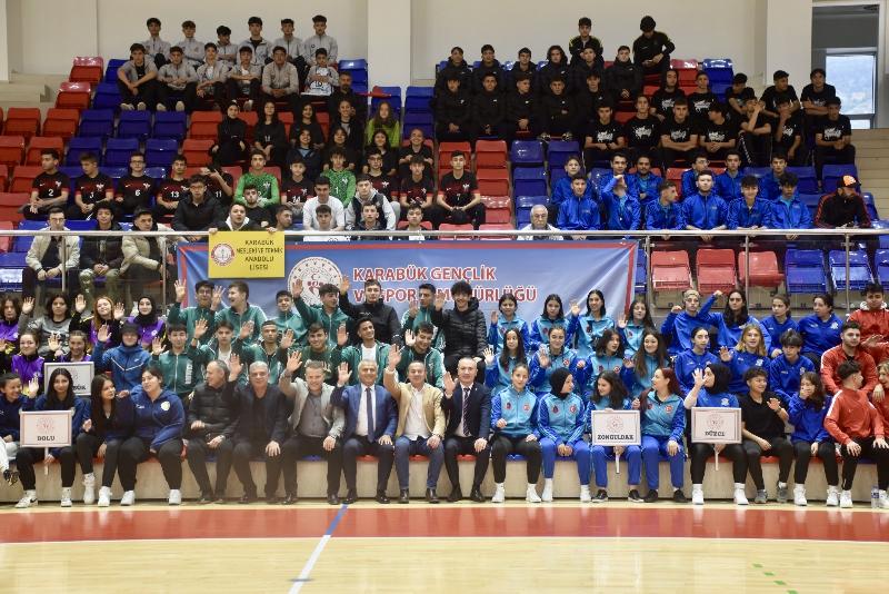 KARABÜK (AA) – Karabük'te Futsal Okul Sporları Genç Erkekler ve Kızlar grup müsabakaları başladı.Yeni Mahalle spor salonlarında 9 ilden 22 okul takımının katıldığı organizasyonun ilk gününde açılış seremonisi düzenlendi.Açılışta konuşan Gençlik ve Spo…