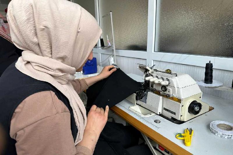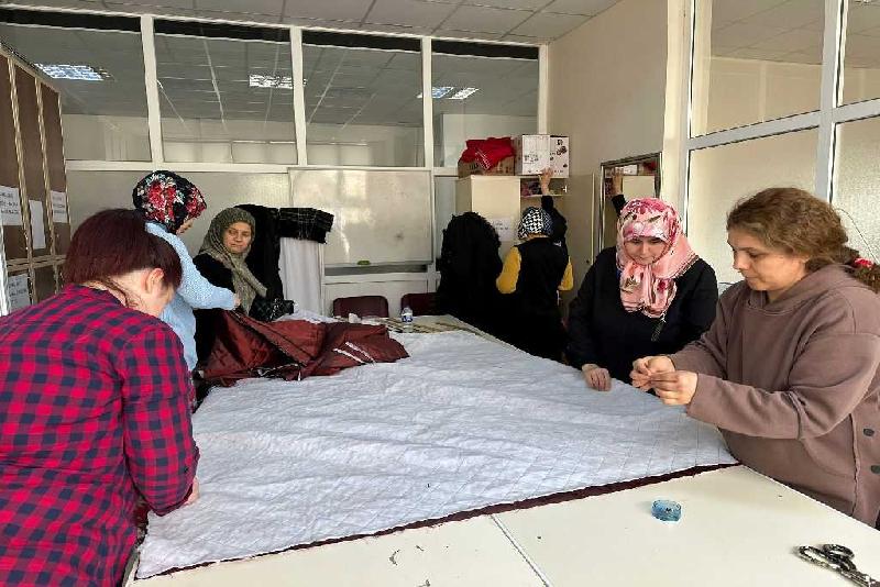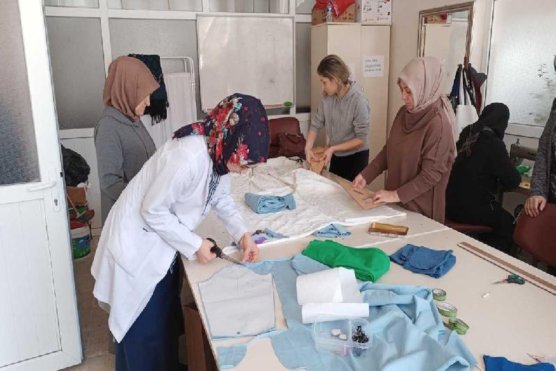 Emek ve Tokatlı mahallelerindeki SAKEM kursiyerleri, eşofman grubu, mont ve kaban dikiyor.