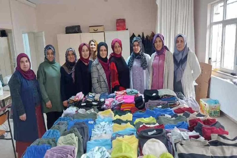Dikimi tamamlanan kıyafetler, hayır çarşısından kaldırılan yardım tırıyla depremzedelere ulaştırılıyor.