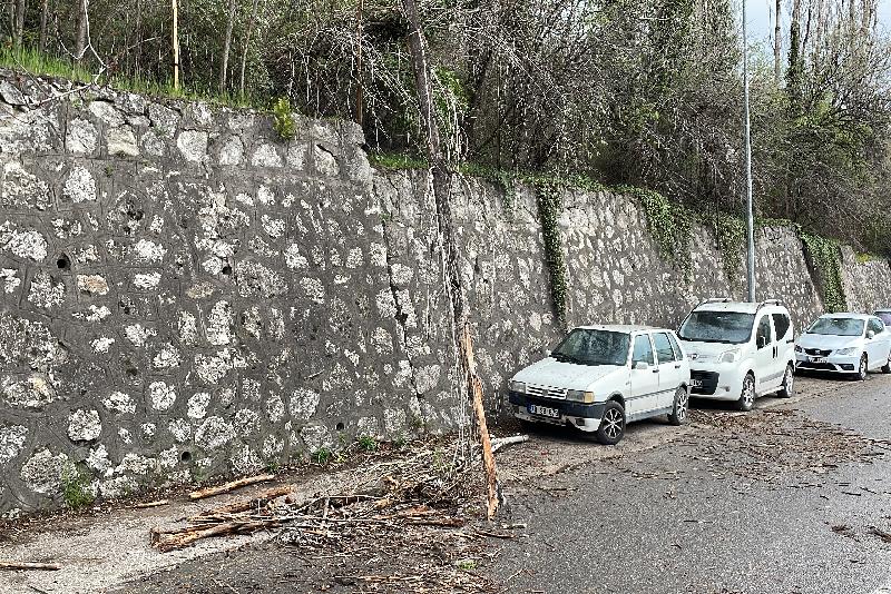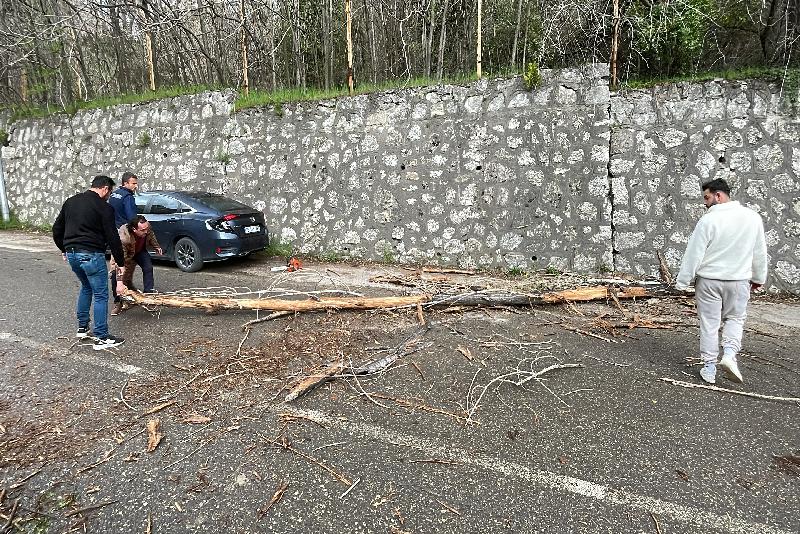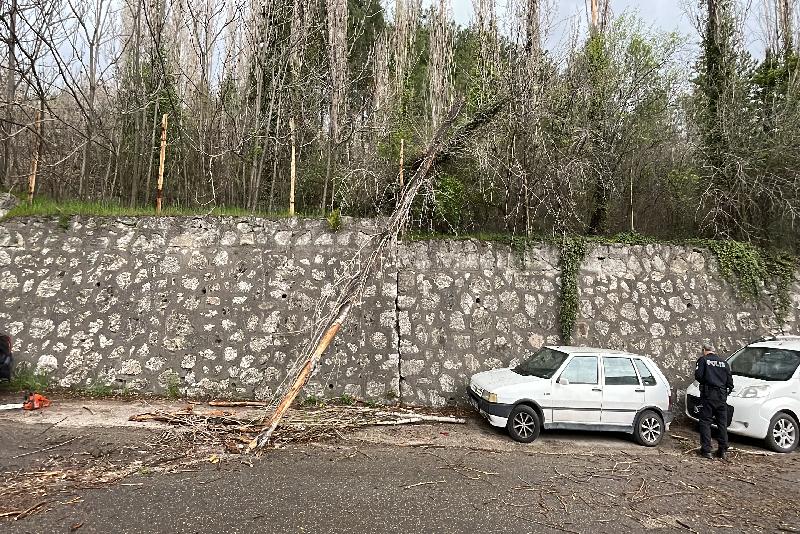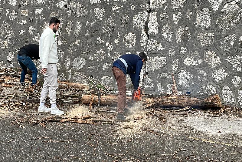 Polisin araçlarla ilgili tutanak tutmasının akabinde ağaç, motorlu testereyle kesimlere bölündü.