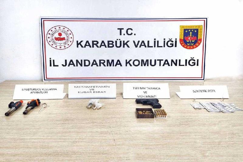 Şüphelinin üzerinde ve evindeki aramada ruhsatsız tabanca, 48 fişek, 0,4 gram sentetik uyuşturucu, 0,8 gram kubar esrar, uyuşturucu kullanma aparatı, 34 sentetik ecza hapı ele geçirildi.