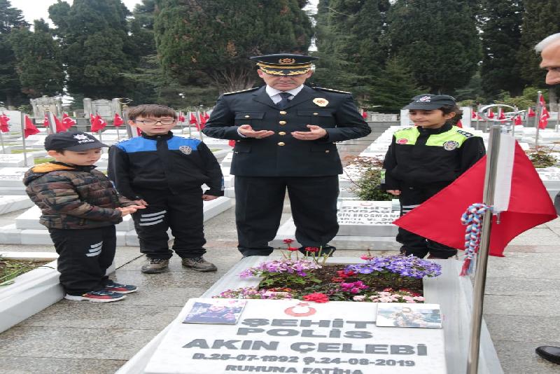 Kur'an-ı Kerim tilavetinin akabinde Esentürk ve beraberindekiler, şehit mezarlarına karanfil bıraktı.