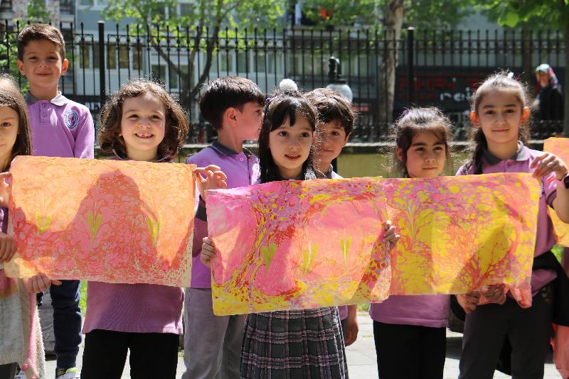 Usta öğreticilerle ebru ve taş baskı yapıp arkeolog eşliğinde deneysel kazı çalışması yapan öğrencilere, kültür varlığı hakkında video izletildi.