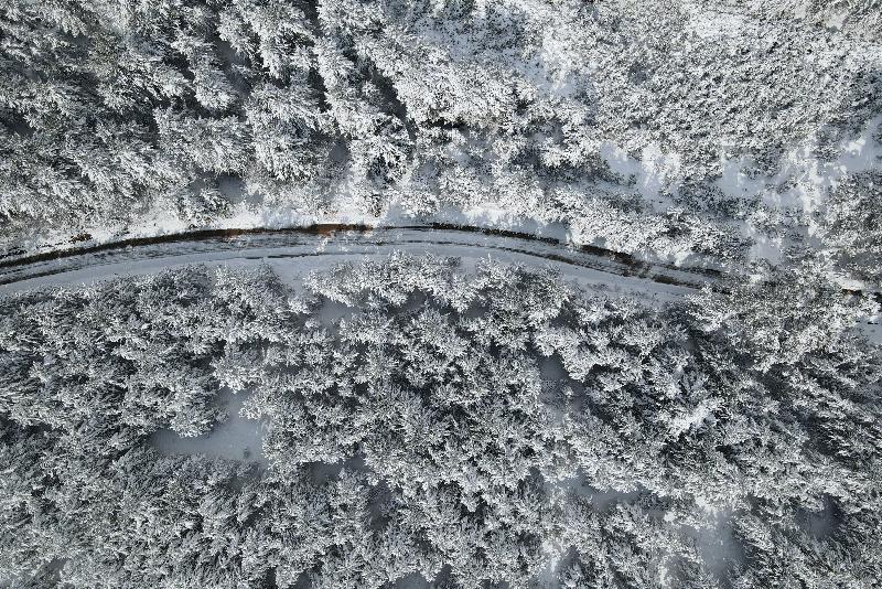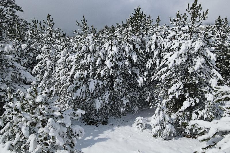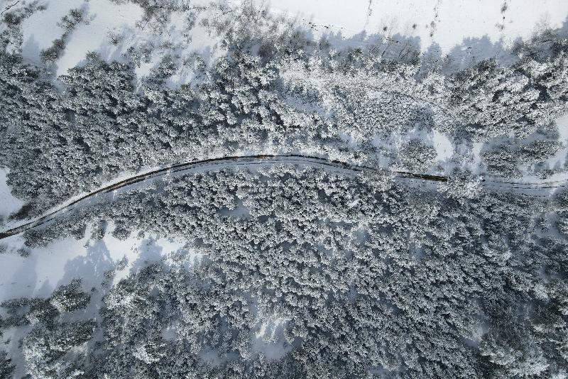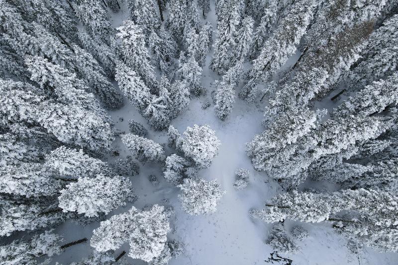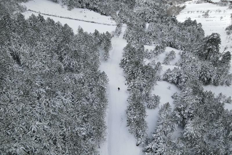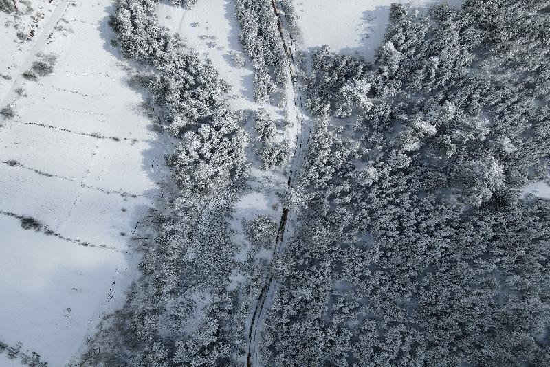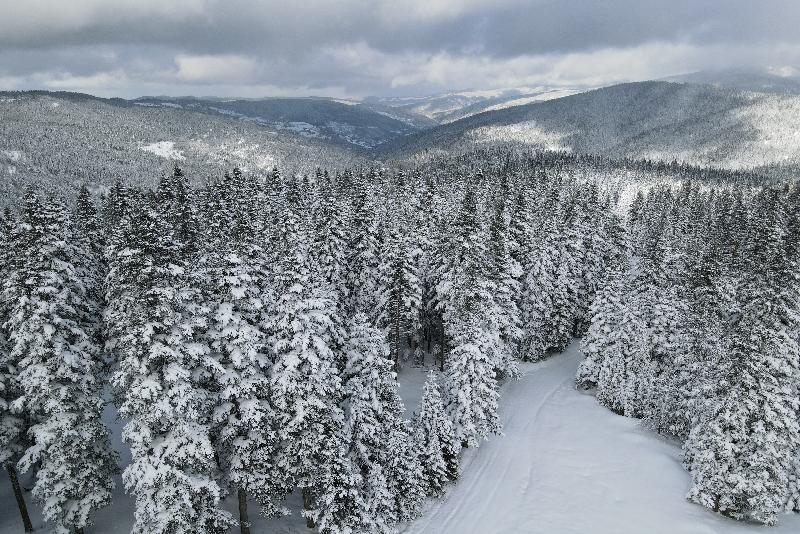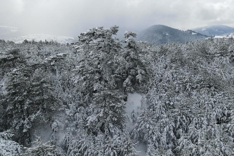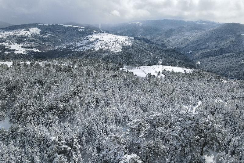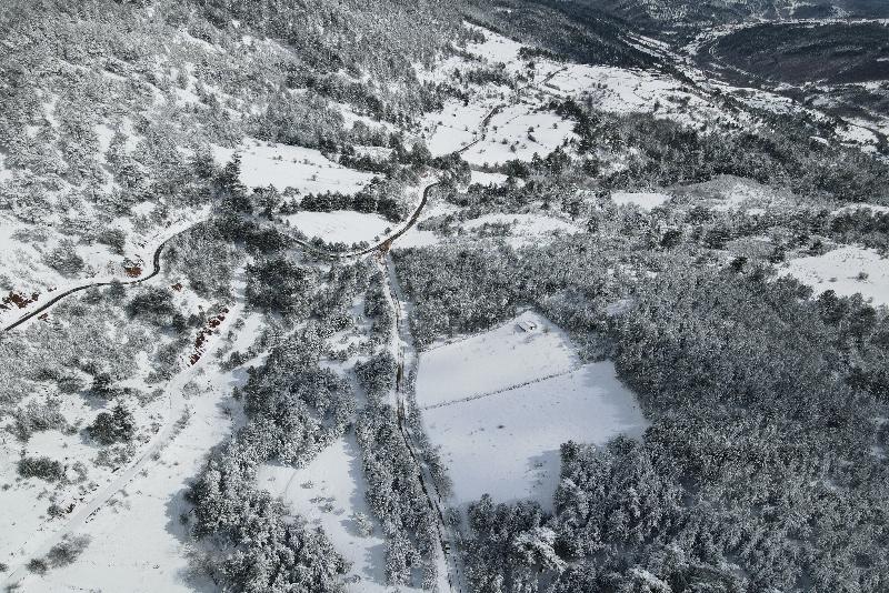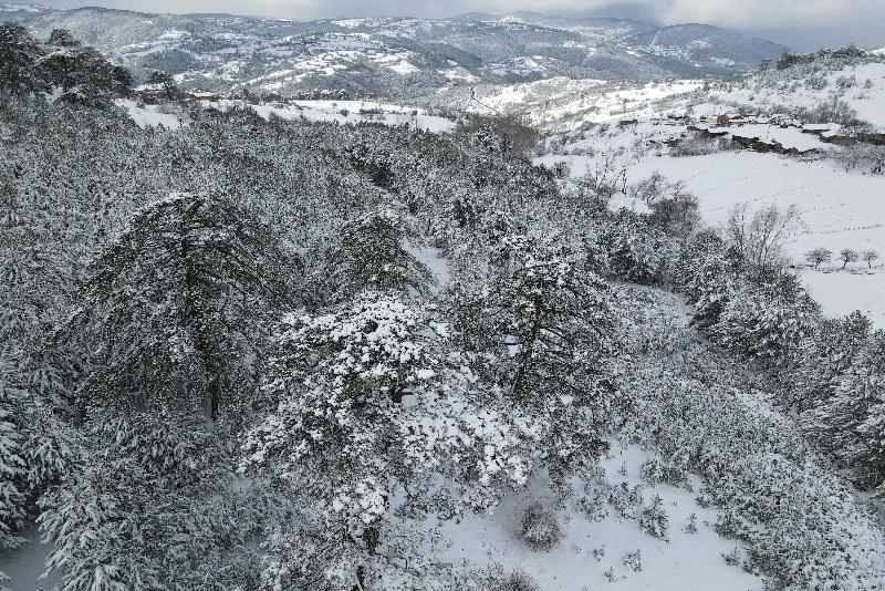 Ormanlık alanların beyaz örtüyle kaplanması dronla görüntülendi.