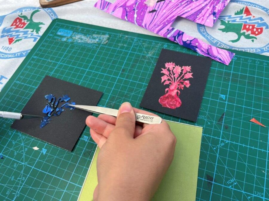 Bu etkinliklerde katılımcılara, renklendirilmiş kağıtlarla geleneksel motifleri kesip birleştirme teknikleri uygulamalı olarak anlatıldı. Bu süreçte el, göz koordinasyonu, dikkat ve sabır gerektiren Kat‘ tekniği ile katılımcıların odaklanma becerilerine katkı sunan bu çalışma geleneksel yöntemlerle hazırlanan özel hazırlanan özel yapıştırıcılar eşliğinde kendi motif kompozisyonlarını oluşturarak bu eşsiz çalışmaları atölye hatırası olarak aldılar.