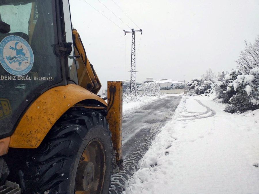Kdz. Ereğli kent merkezinin özellikle yüksek rakımlı bölgelerinde dün geceden itibaren etkili olan kar yağışına karşı yollarda gerekli tedbirleri alan Kdz. Ereğli Belediyesi, kar temizleme çalışmalarını sürdürüyor.