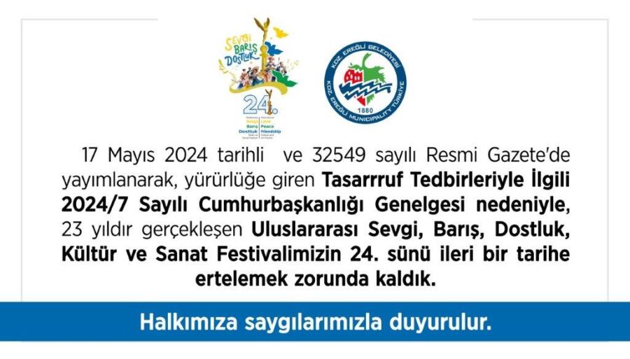 “Ülkemizde bir takım sıkıntılar var. Bunları bizden daha iyi biliyorsunuz, takip ediyorsunuz. Problemler gün geçtikçe büyüyor. İşin kötü tarafı da geleceği göremiyoruz. Geçmiş dönemlerde belediye başkanıyken 6 ay sonrasını rahat bir şekilde görebilirdim. Ama içinde bulunduğumuz ortamda yarın sabah ne olacağını göremiyoruz. Planlama yapamıyoruz. Belediyecilikte planlama, öngörü çok önemlidir. Yıllardan beri bu işi yapıyorum ama maalesef önümüzü göremeyecek duruma geldik. Mesela önümüzü göremediğimiz için Mayıs ayının ilk haftasında sizlerle bir araya gelerek festival programını ve katılacak sanatçıları açıklamıştık. 24. Sevgi, Barış, Dostluk Kültür ve Sanat Festivali’ni 4-5-6-7 Temmuz tarihlerinde gerçekleştireceğimizi ifade ettik. Bu yıl yapılan anketlerin sonucunda da Ereğli halkının çok fazla görmek istediği isimleri İrem Derici, Hakan Altun, Simge Sağın, kıraç, Betül Demir ve Mert demir ile anlaşmalar imzaladık. Çok büyük bir şevk ile çalışmalarımıza devam ediyor idik. Duyurumuzun ardından sadece Ereğli halkından değil, gençlerimizden, Türkiye’nin her yerinden hatta yurt dışından farklı ülkelerdeki vatandaşlarımızdan inanılmaz mesajlar aldık. Çünkü insanlar bir bunalım içerisinde, eğlenmek istiyorlar. Bunun farkındayız, sizlerde farkındasınız. Halkımızla büyük bir heyecanla yine bir arada olmak için, coşkuyla eğlenmek için, kültür ve sanata doymak için, birkaç günde olsa sıkıntılarından kurtulmak için Ereğli’ye festivale gelmek için bütün ülkedeki insanlar, yurtdışından insanlar planlarını yapmaya başlamışlardı. Müthiş talepler alıyorduk. Hatta Eyüp Bektaş’la bir gayrete girdik, onun gayretleriyle Aziz Sancar’a ödül vermek için Ereğli’ye davet etmeye karar vermiştik. Çokta müspet yönde ilerliyordu. Ankara Büyükşehir Belediye Başkanı Mansur Yavaş’a ödül vermek için hazırlıklarımızı yapmıştık. Gelecek günlere güzel bakıyorduk, eğlenceli bir ortam olacaktı. Bütün anlaşmalarımızı yapmamıza rağmen 17 Mayıs 2024 tarihli 35549 sayılı resmi gazetede yayımlanarak yürürlüğe giren tasarruf tedbirleriyle ilgili 2024-7 sayılı Cumhurbaşkanlığı genelgesiyle Türkiye’den sinyaller gelmeye başladı. İzmir’in en büyük uluslar arası müzik festivali iptal edildi. Bir çok yerlerde iptalleri duymaya başladık. Yine bekledik sabırla belki bir ara buluruz diye. Ama maalesef bu genelge oturdu ve bizde Uluslar arası Sevgi, Barış, Dostluk, Kültür ve Sanat Festivali’ni iptal etmek zorunda kaldık. Hatta genelgede 3 yıl bu uygulama devam edecek diyor.