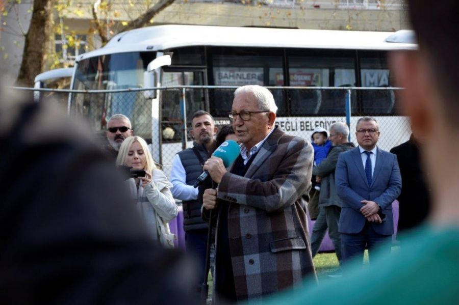 Takımın yürümesi yazım. Yürümesi için bütün Ereğli halkından destek bekliyoruz. İnanılmaz olaylar oluyor. Zaman zaman bizi duygulandırıyor. Çocuklar kadınlar ev ev dolaşıp forma satmaya çalışıyorlar. Şimdi Organize sanayi bölgesinden sanayicilerden iş adamlarından destek bekliyoruz. Bu takıma destek vermenizi ve bu birlikteliğimizin devam etmesi en büyük heyecanla beklediğimiz bir olay. İnşallah çok iyi neticeler alacağız. Teknik heyetimize yürekten inanıyoruz futbolcularımıza inanıyoruz. El birliğiyle bu işi götüreceğiz. Hepiniz birer pırlantasınız. Sizleri daha iyi yerlerde görmek en büyük arzumuz. Ereğli halkı sizlerden ne bekliyor; bunu çok iyi biliyorsunuz. Allah yolunuzu açık etsin. Bahtınızı açık etsin. Allah ailenize çoluk çocuğunuzla beraber hayat size hep gülsün hep mutlu olun inşallah.