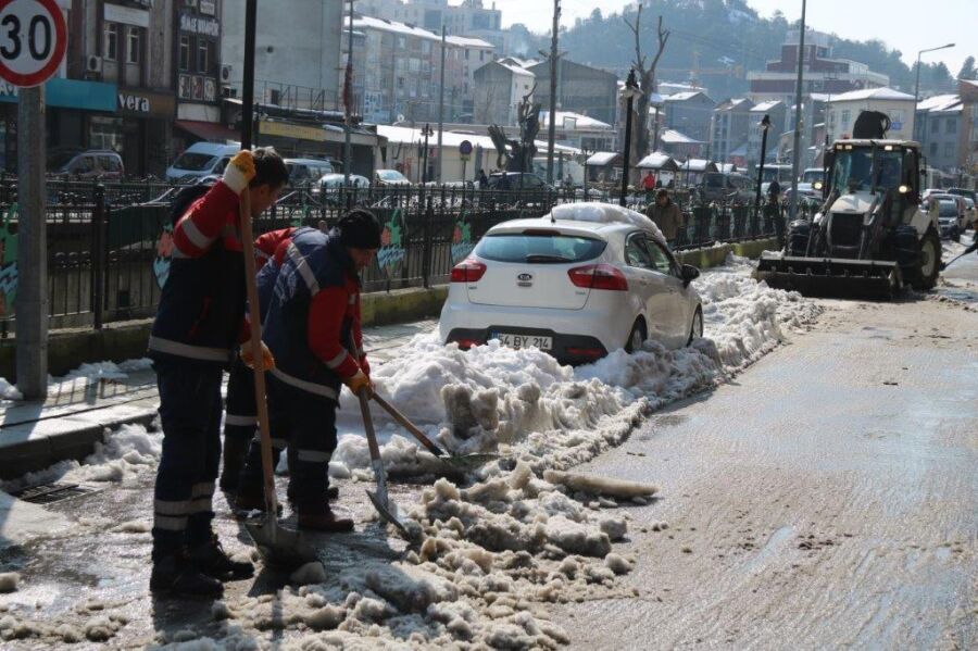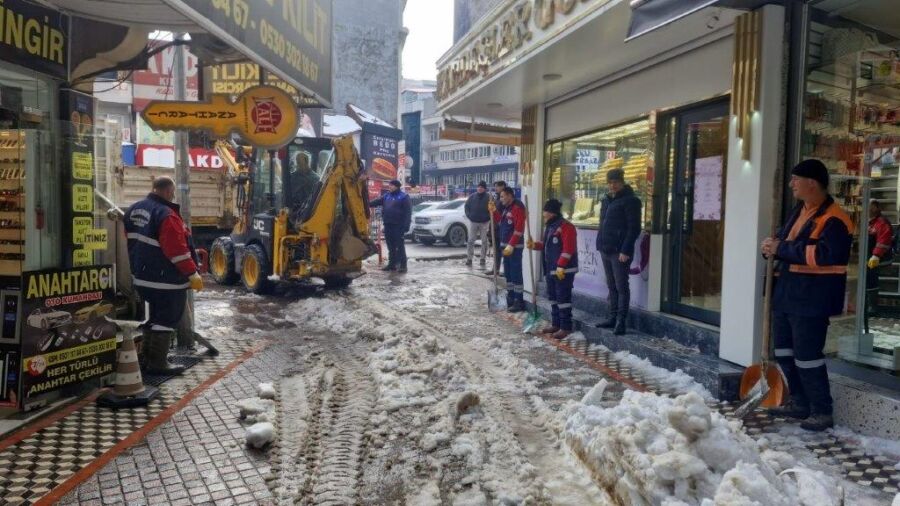 Temizlik İşleri, Fen İşleri ve Su Kanalizasyon İşleri Müdürlüğü ekipleri ellerinde küreklerle kaldırım ve yaya yollarını temizliyor. İş makineleri kentin 600 kilometrelik yol ağında temizlik çalışmalarına devam ediyor dedi.