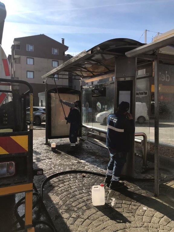 Bu kapsamda, kent içi 650 kilometrelik yol ağında bulunan 285 toplu taşıma durağında detaylı temizlik yaptı. Durak camları, oturma alanları ve metal yüzeyler özenle temizlenirken, çevre düzenlemeleri de yapılarak vatandaşların daha sağlıklı ve konforlu bir bekleme alanına kavuşması sağlandı.