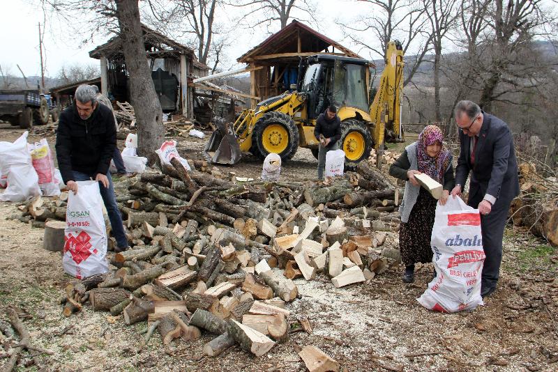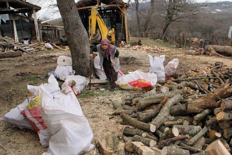 İlerlemiş yaşına karşın köydeki komşularıyla el birliği yapan Can, kesilen odunları çuvallara doldurarak çalışmalara dayanak oluyor.