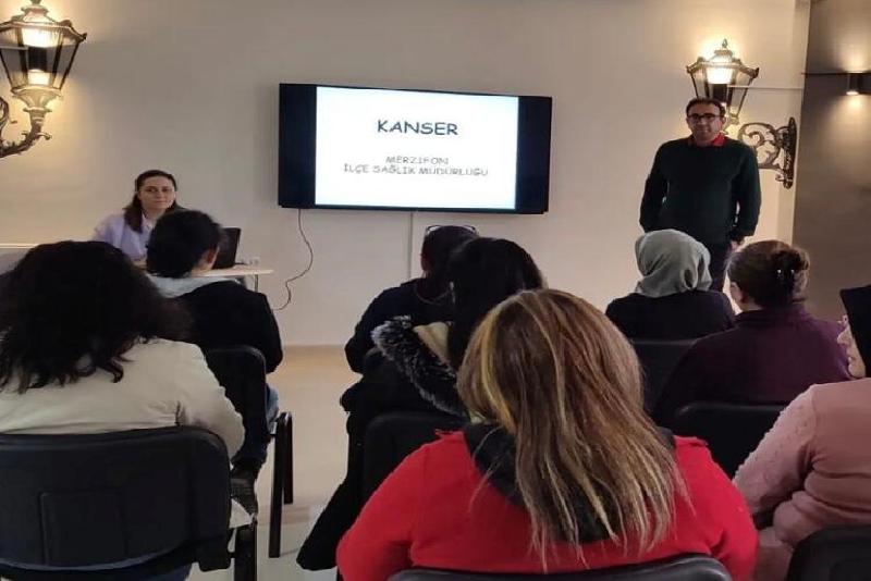 İlçe Sıhhat Müdürlüğü grupları, Aile Takviye Merkezi'ndeki (ADEM) kurslara katılan kursiyer bayanları ve Yardımeli Derneği üyelerini kanserde erken teşhisle hayat kurtarmak için bilgilendirdi.