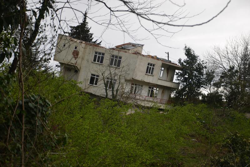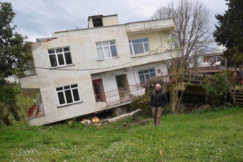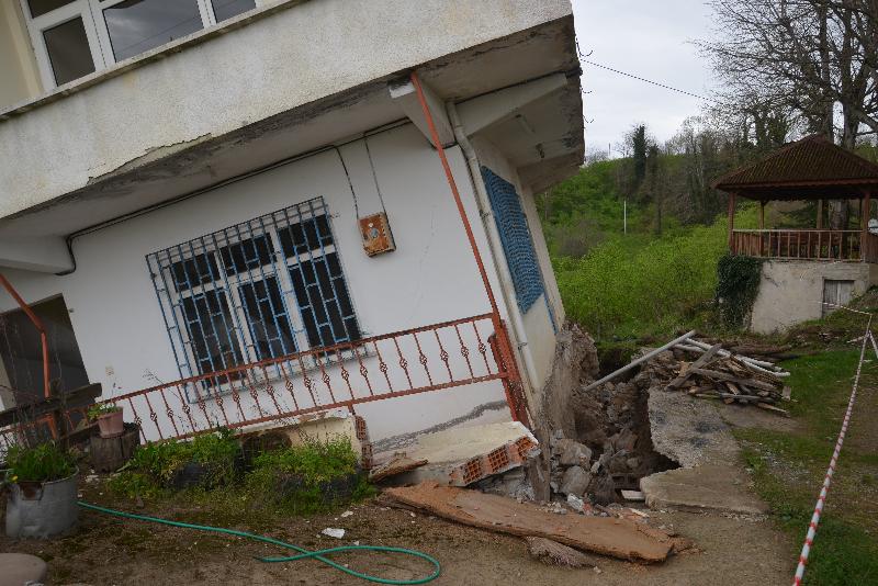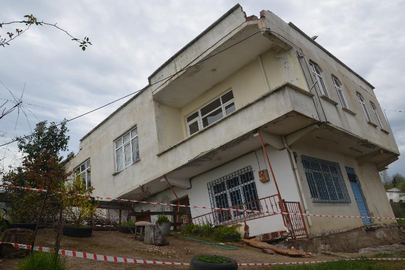ORDU – 67aydinhaber – Ordu'da yaklaşık 4 yıl evvel heyelan nedeniyle 10 binanın boşaltıldığı mahalledeki 2 katlı bina, yine yaşanan heyelan sonrası yan yattı.