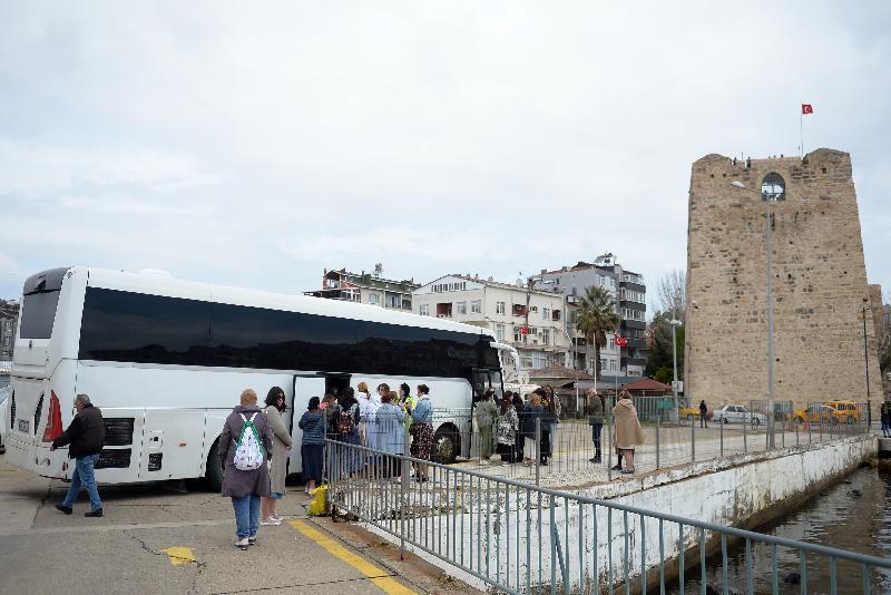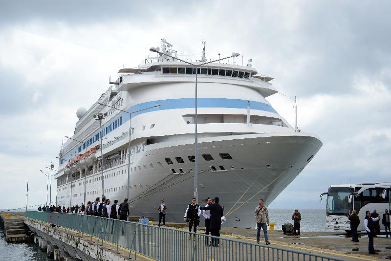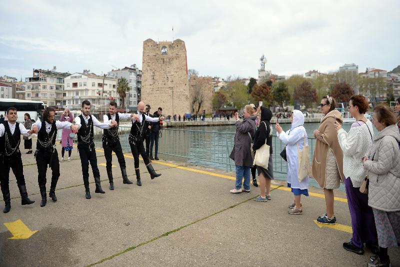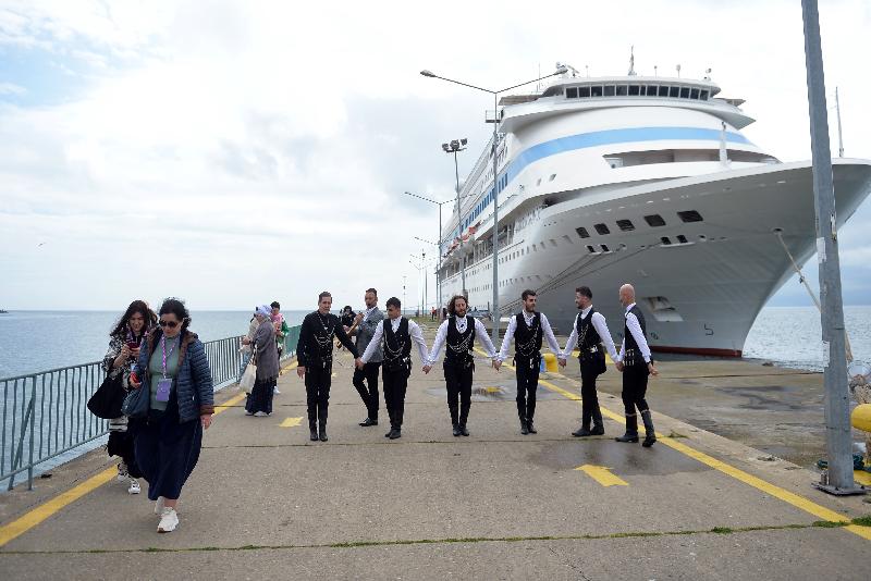 Halk oyunları ekibinin gösteri yaptığı karşılamanın ardından ziyaretçiler, kendilerini bekleyen tur otobüsleriyle kentteki tarihi ve turistik yerleri görmek için limandan ayrıldı.